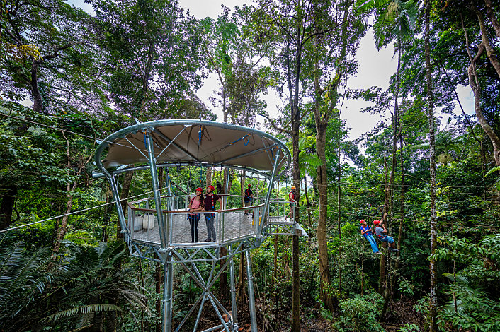 Rise to the tree-canopy on our world’s-first Human Hamster Wheel Cable Lift, before flying along the flying-fox cables to the next of 6 tree-top platforms, each interconnected to the next by another flying-fox cable. At each platform your guide interprets the nearby rainforest for you, pointing out areas of interest, wildlife and plants, as well as suggesting some great photo opportunities.